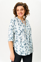 Блузка женская свободного покроя, удлиненная, с рубашечным рукавом на манжете по низу, по переду на уровне груди - накладной карман, застежка спереди на планку с пуговицами, воротник рубашечный на стойке, низ изделия фигурный, с закругленными разрезами по боковым швам.