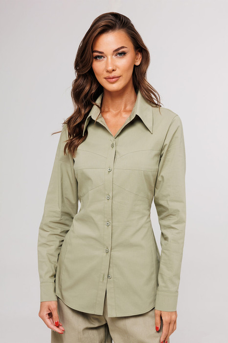 Блузка полуприлегающего силуэта, с втачным одно шовным рукавом, со складкой и манжетой, с застежкой на петлю-пуговицу. Полочка с центральной застежкой на петли-пуговицы и с фигурными подрезами, имитирующими лиф. Спинка с рельефами и шнуровкой от рельефов. Воротник рубашечный отложной на стойке. Спинка и полочка с фигурным низом.