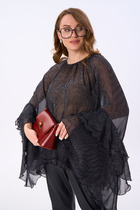 Блузка женская "оверсайз" прямого силуэта. Воротник отложной на стойке. Рукав спущенный с притачной широкой манжетой с отворотом. Разрез рукава обработан планкой. Застежка по переду потайная, на пробивные петли и пришивные пуговицы. Дизайнерская вышивка на воротнике.