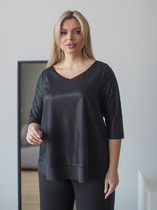 Базовая рубашка. Линия плеча спущена. Рукав длинный на манжете. По переду накладные карманы и застежка на петлю пуговицу. На воротнике пришит декоративный элемент в виде губ. Низ изделия фигурный.