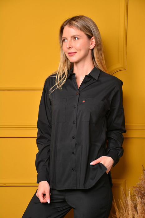 Рубашка «мужского» кроя без вытачек. Рукав втачной с манжетой на 2 петли и пуговицы. Воротник отложной со стойкой. Кокетка на спинке, спинка со складкой. Низ прямой, по бокам разрезы. Спинка длиннее переда.