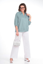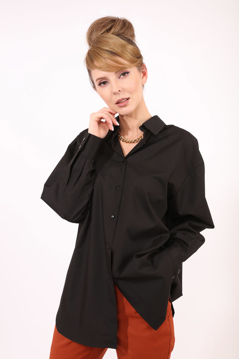 Блузка женская большого объема, прямого силуэта. На детали спинки расположена двойная кокетка, переходящая на деталь полочки. Под кокеткой на спинке встречная складка. Воротник рубашечный отложной на стойке. Застежка планка центральная на прорезные петли и пуговицы. Линия плеча спущенная, рукав рубашечный, длинный. В нижней части рукава заложены складки, заканчивается манжетой с двумя прорезными петлями и пуговицами. Разрез рукава обработан планкой. Низ блузки разноуровневый: спереди короче, сзади длиннее. Длина изделия до середины бедра.