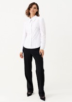 Стильная рубашка свободного кроя с центральной планкой на застежку пуговицы по полочке из ткани содержащей хлопок, со спущенной линией плеча. Изделие с горловиной стойкой. По переду рубашки накладные карманы. Рукав втачной двух шовный, в 12см от низа рукава кулисrа со втянутым в нее шнуром для затягивания. Спинка изделия с кокеткой и заложенной складкой. Низ рубашки фигурный с разрезами по боковым швам.