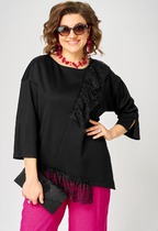 Изящная хлопковая рубашка прямого кроя с широкими втачными рукавами - фонариками с манжетой, декорированной атласной лентой с принтом. Воротник рубашечного типа. Изделие застегивается на петли и пуговицы.