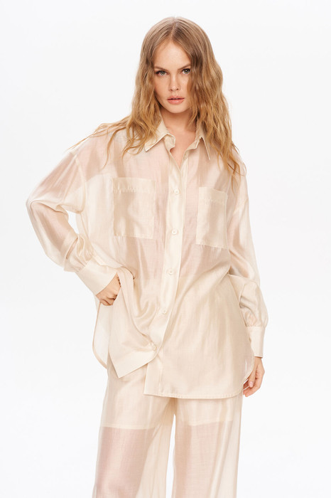 Детали: рубашка прямого силуэта, спущенная линия плеча, застежка на петли и пуговицы, длинные рукава с притачными манжетами, фигурный низ.