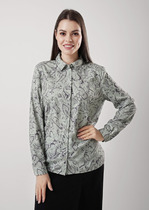 Рубашка прямого кроя с застёжкой-планкой на шесть петель и пуговиц. На переде обработаны нагрудные вытачки, кокетки, накладные карманы с клапанами, прорезные карманы с листочками. Спинка с кокеткой, складкой и отделочной шлёвкой по центру. Рукав втачной, длинный, по низу застёгивается манжетой с пуговицей. Воротник стояче-отложной с отрезной стойкой. В боковых швах разрезы, низ рубашки разноуровневый. Материал хорошо тянется(трикотажная основа) и держит тепло, поэтому жакет комфортно носить в прохладную погоду.