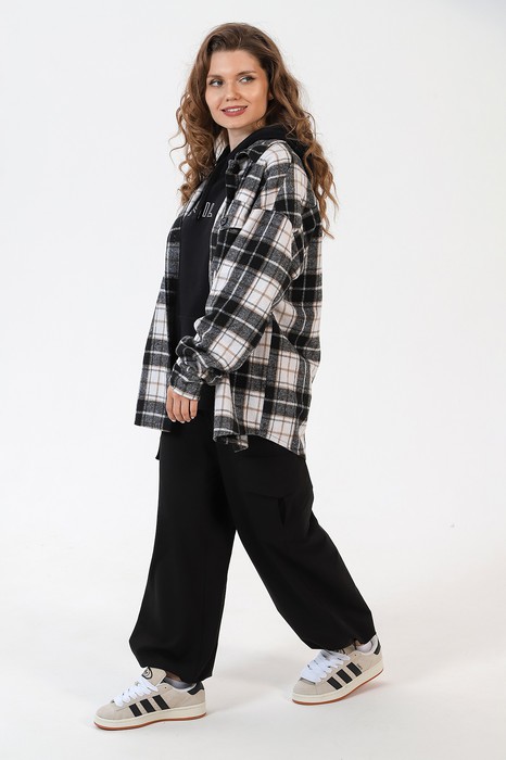 Рубашка женская из тканого полотна с рисунком в крупную клетку, длинными втачными рукавами с разрезами на притачных манжетах, застегивающимися на обметанные петли и пуговицы, фигурной линией низа и стояче-отложным воротником. Полочки - с двумя нагрудными карманами и клапанами фигурной формы. Спинка - с притачной кокеткой, выкроенной по косой. В швах соединения манжет с рукавами обработаны по одной складочке. При эксплуатации изделия следует обратить внимание на то, что после ВТО и стирки материал дает усадку по ширине и длине.