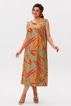 Сарафан из кулирки. Дизайн в виде цветов на темном фоне. Тонкие лямки, шнурок на груди, общая длина чуть ниже середины бедра. Два варианта расцветки. Размеры от 44 до 54. Внимание, данный товар не продается в розницу!