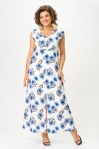 Сарафан полуприлегающего силуэта, расширенный к низу, отрезной под грудью. Горловина V образная, линия плеча спущенная с кулисами для сборки.