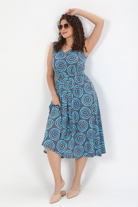 Сарафан женский из трикотажного полотна «кулирка» с набивным рисунком, полуприталенного силуэта, удлиненное, расширенное книзу, без рукавов, с горловиной овальной формы, окантованной основным материалом и карманами в боковых швах. Изделие комплектуется съемным поясом.