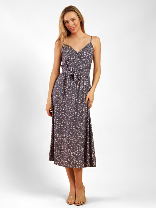 Сарафан молодежный из тканого полотна «штапель» с набивным рисунком, с углубленной V-образной горловиной, на узких бретелях, отрезное по линии талии, с расклешенной юбкой, собранной с помощью эластичной тесьмы. Горловина и проймы окантованы основным материалом. Переднее полотнище юбки из двух частей, в соединительном шве выполнен разрез. Изделие комплектуется съемным поясом, завязывающимся на талии.