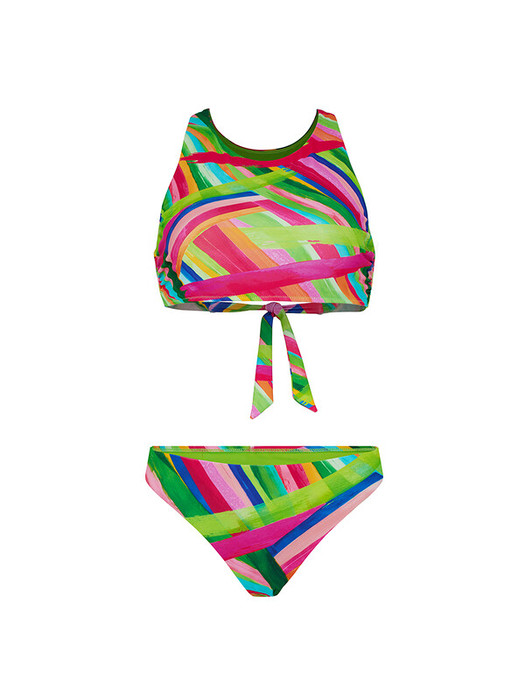 Спортивный купальный костюм с чашкой soft bra. Бюстгальтер-топ из эластичного материала, на подкладе, со съемными формованными вкладышами, без каркасов, с боковыми корсетными вставками. Завязка на спине.
