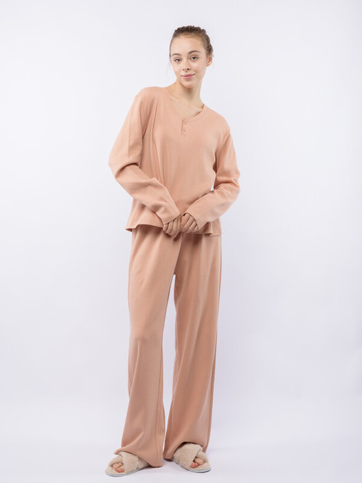 Домашний костюм OVERSIZE из эластичного вафельного трикотажа розово-бежевого цвета состоит из лонгслива и широких брюк. Лонгслив с V-образным вырезом с 2 пуговицами, отделка горловины из материала изделия. Рукав длинный без манжет, подгиб и плоский шов по запястью и низу изделия. Брюки на широкой резинке со шнурком. Подгиб и плоский шов по низу брюк. XS-XS(170-84-90), S-S(170-88-94), M-M(170-92-98), L-L(170-96-102), XL-XL(170-100-106)