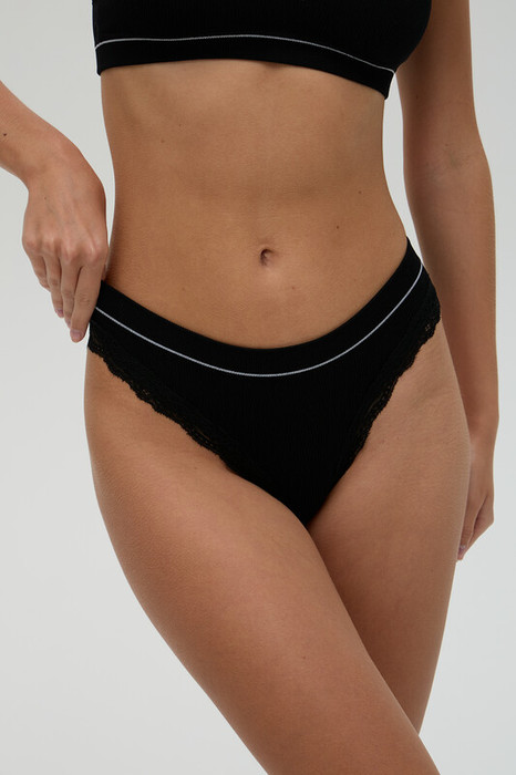 Трусики формы Brief со средей посадкой выполнены из нежного полотна в рубчик. Нежное кружево по срезу ножек и резинка, с вывязанной полоской контрастного цвета, по верхнему краю изделия украшают его.Ластовица из хлопка