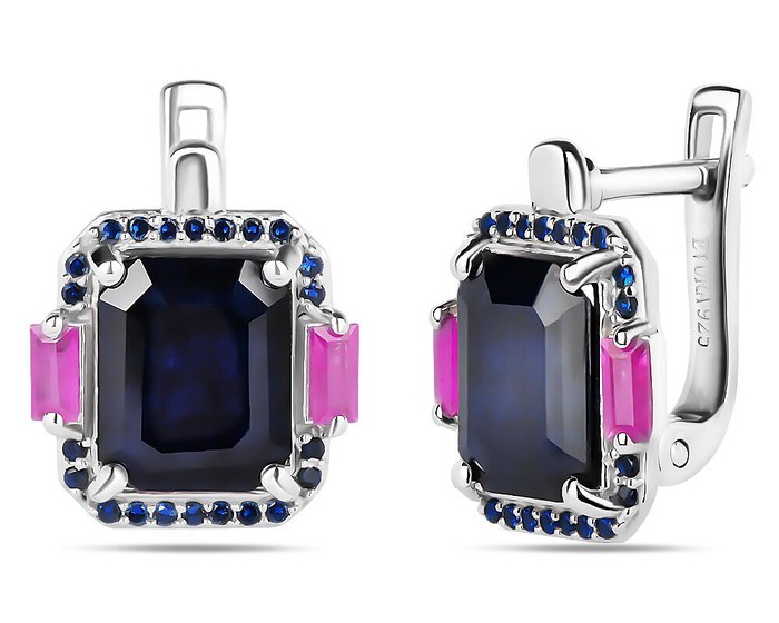 Серьги, арт.658696 Серебро Серебро 925, 5,97 гр., 2 сапфир корунд октагон 8х10 мм/6.10 ct , 4 рубин корунд багет 2х4 мм/0.60 ct. , наносапфир