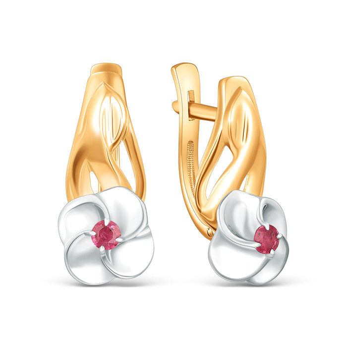Серьги цветок из золочёного серебра с рубином и родированием п2-684зр415н