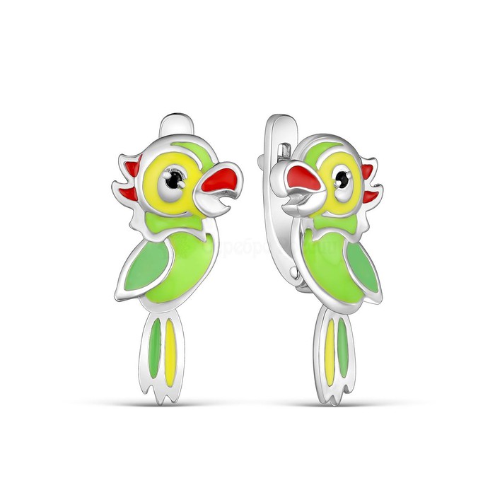 Серьги детские из серебра с эмалью и фианитами родированные - Попугаи