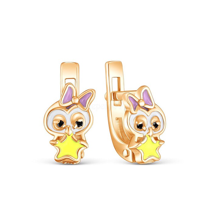 Серьги детские из золочёного серебра с эмалью и фианитами - Совушки