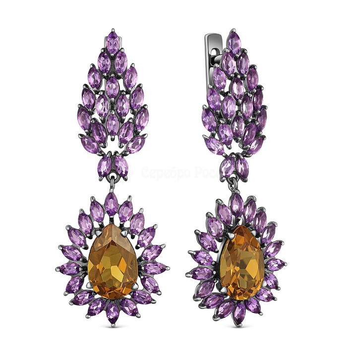 Серьги из серебра с ситаллом цв.султанит и нат.аметистом родированные