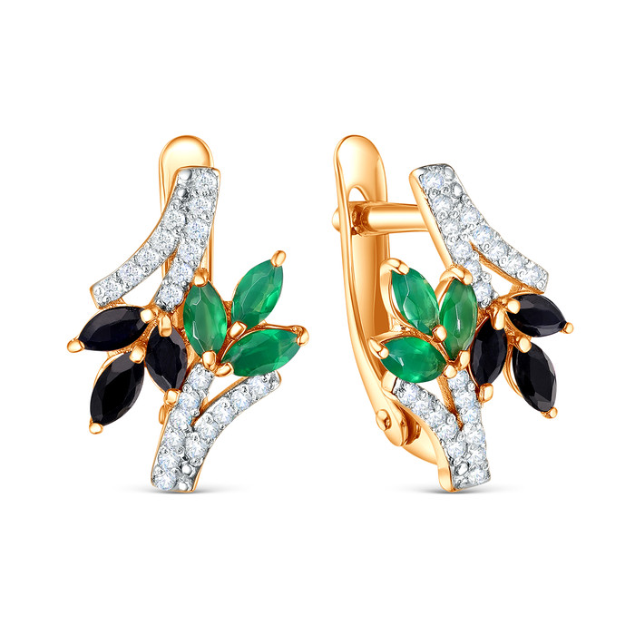 Серьги из золочёного серебра с сапфиром, агатом, фианитами и родированием 925 пр