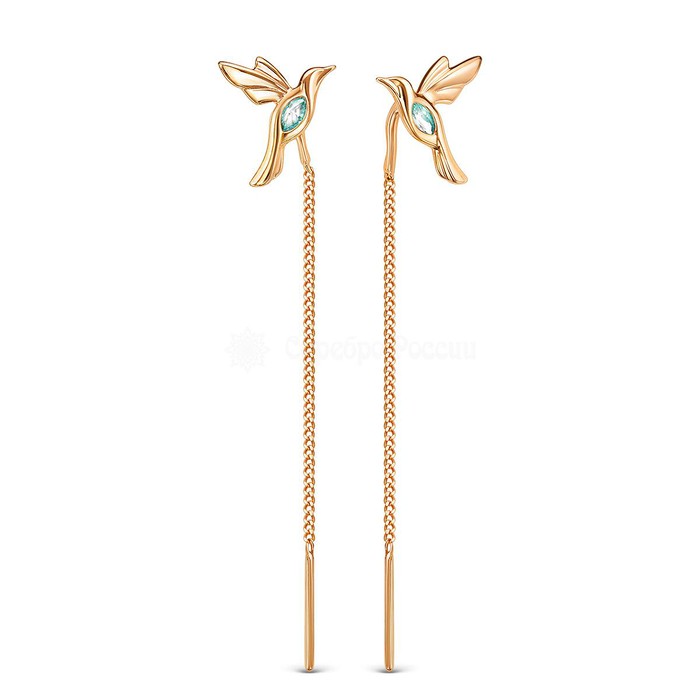 Серьги-продёвки Птички из золочёного серебра с плавленным кварцем цвета swiss то