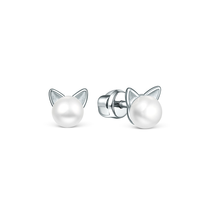Серьги-пусеты из серебра с культивированным жемчугом родированные - Кошки 925 пр