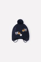 Забавная зимняя шапочка для мальчиков с двумя помпонами. Верхний слой связан из полушерстяной мериносовой пряжи, нижний слой выкроен из хлопкового полотна и полностью пришит, утеплитель синтепон. Спереди светоотражающий лейбл. Аккуратные удобные завязки без узлов и наконечников.