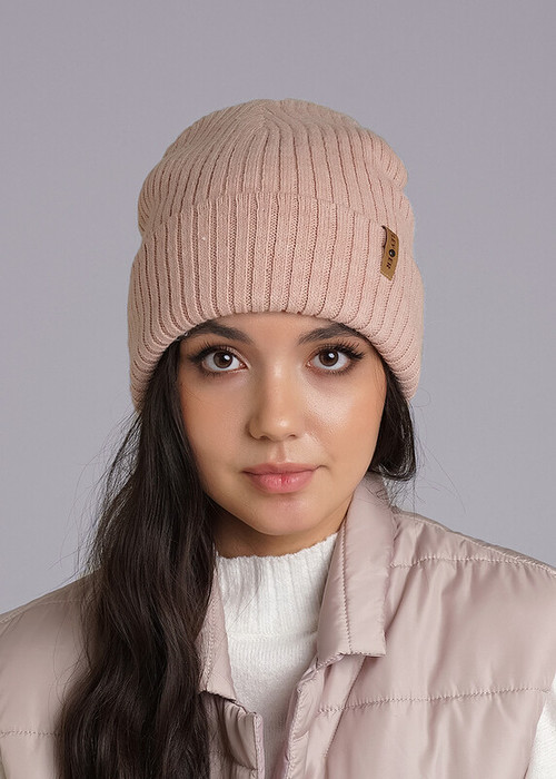 Шапка женская ластичного переплетения, декорирована нашивой логотип. Утепление флисовым подкладом по всей голове. Подойдёт для холодной зимы.