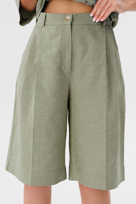 Шорты-бермуды женские, свободного силуэта, на поясе со шлевками. Застежка на молнию и пуговицу. По переду заложены складки. По бокам действующие угловые карманы.