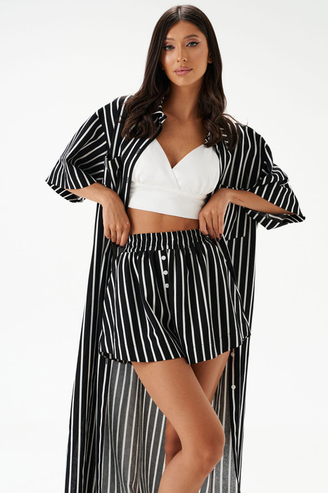 Шорты свободного кроя. Выполнены из натурального полотна - лен, черного цвета в полоску. А-силуэт. Пояс на резинке. По передней части имитация застежки на 3 пуговицы. Карманы-хулиганы. По передней и задней части вертикальные швы. Длина 36 см