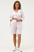 Шорты свободного кроя, выполнены из струящайся ткани синего цвета. Пояс на резинке с кулиской, по низу шорт нашита рюша из ткани основного изделия. Длина по боковому шву с учетом рюши - 34 см.