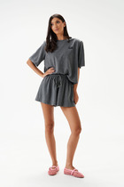 Шорты спортивные, короткие. Пояс притачной, отстрочной на резинке с втянутым в него декоративным шнурком. По переду карманы в боковых швах с нахлонным входом в него. По низу шорты с притачной планкой с необработанным краем и закруглением к боковым швам.