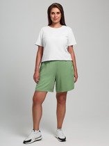 Женские короткие шорты со средней линией талии и удобным широким поясом. Отлично адаптируются по фигуре и обеспечивают полную свободу движения. Изготовлены из мягкого высококачественного хлопка, который превосходно пропускает воздух, приятно ощущается на теле и подходит для чувствительной и нежной кожи.Удобная резинка зафиксирована в шве, соединяющем пояс с изделием. Добавление эластана обеспечивает комфортное облегание.