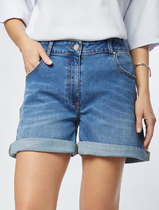 Шорты свободного кроя, прямые. Спереди застёжка-молния, карманы. Пояс притачной с резинкой по спинке. Длина изделия с поясом 54 см. Длина изделия по шаговому шву 25 см