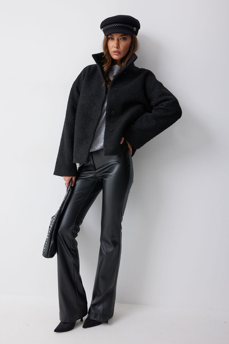 Жакет прямого силуэта из букле на трикотажной основе. Воротник-стойка. Центральная застежка на крючки. Рукав со спущенной линией плеча. По переду прорезные  карманы. Жакет на подкладке. Обращаем ваше внимание, что фурнитура может отличаться от фото.