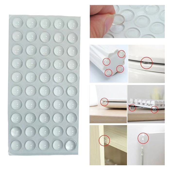 Силиконовые самоклеющиеся накладки на мебель используются для мебели кухни, ванных комнат, гостиной, в выдвижных ящиках для смягчения удара при закрывании, а также в качестве подставок под стеклянные, пластмассовые предметы, ноутбуки, с целью предотвращения скольжения по гладкой поверхности. В набор входит 50 прозрачных силиконовых демпферов (амортизаторов) диаметром 10 мм на самоклеящейся основе.