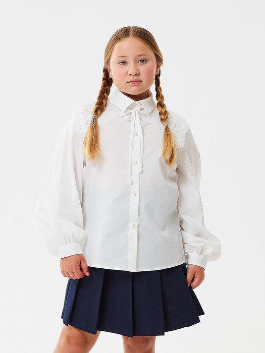 Романтичная блузка PLUS SIZE из смесового хлопка полуприлегающего силуэта с отложным  воротником, дополненная съемным воротником из органзы по краю которого выполнена фигурная вышивка с фестонами. Объемный к низу рукав на сборке и манжете. Наличие съемного воротничка позволит использовать эту блузку как базовый вариант на каждый день, так и для торжественных случаев. Высокое содержание хлопка в составе обеспечивает отличную воздухопроницаемость и комфорт в повседневной носке. Отличное решение для создания романтичных образов  маленькой модницы.