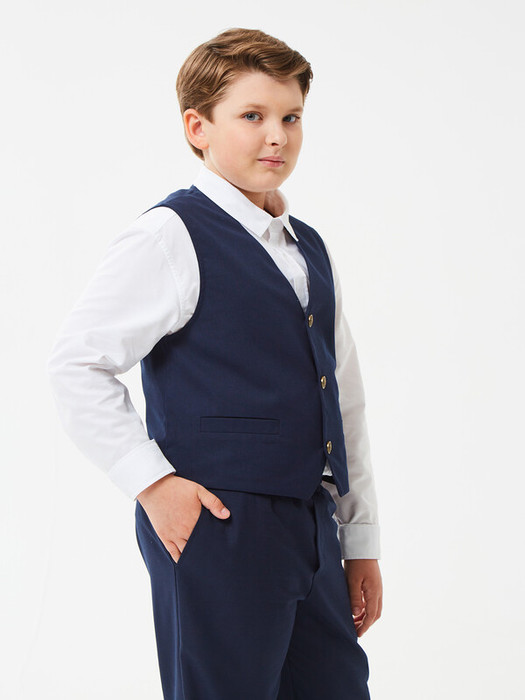 Жилет из смесовой вискозы на вискозной подкладке для мальчика с V-образным вырезом и боковыми прорезными карманами с листочкой . Спинка дополнена хлястиком с металлической пряжкой для регулировки жилета по полноте. Застегивается на три пуговицы.