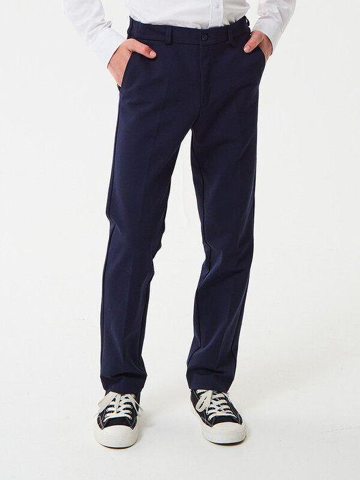 Брюки зауженные из трикотажа джерси для мальчика. Пояс с еврорезинкой сзади. На передней части брюк боковые карманы, горизонтальные защипы и застёжка - гульфик на молнии. На правой задней половинке брюк - карман с узкой листочкой. Отличный вариант на каждый день.