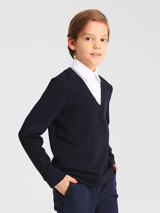 Джемпер трикотажный для мальчика прилегающего силуэта с имитацией манишки из сорочечной ткани контрастного цвета. Воротник отложной со стойкой. Укороченная застёжка на переде на планку с пуговицами. Рукава втачные длинные, на манжете. По низу изделия притачной пояс. Отличный вариант на каждый день.