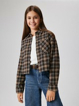 Укороченная блузка свободного силуэта для подростков из смесового хлопка с отложным воротником со стойкой и короткими свободными рукавами. На полочке расположен накладной карман с декоративным элементом. Застежка на планку с пуговицами. Высокое содержание хлопка в составе обеспечивает отличную воздухопроницаемость и комфорт в повседневной носке. "
