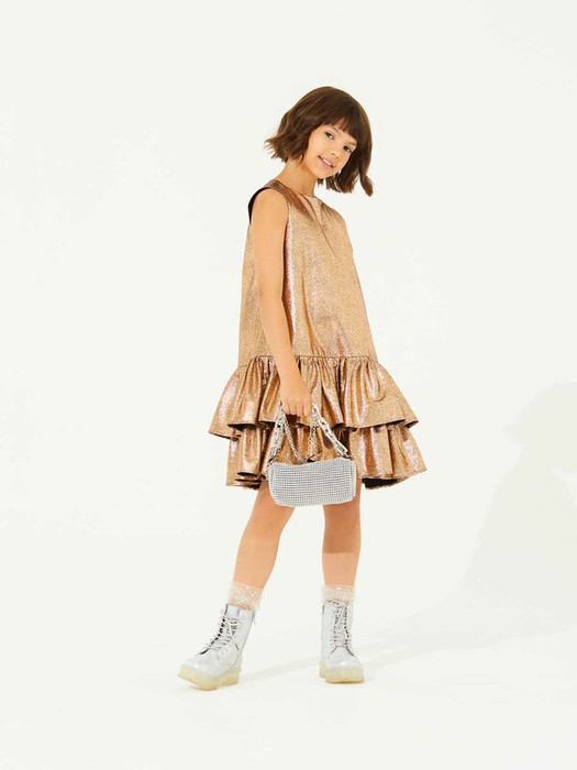 Стильное платье прямого силуэта, которое идеально подойдёт для новогоднего утренника. Верхний слой платья выполнен из блестящей ткани, а приятная к телу подкладка из хлопка обеспечивает комфорт и отводит влагу во время активных игр. У платья заниженная линия талии, по которой выполнена юбка из двух слоев пышных оборок. Застежка на потайную молнию по спинке обеспечивает легкость при надевании.