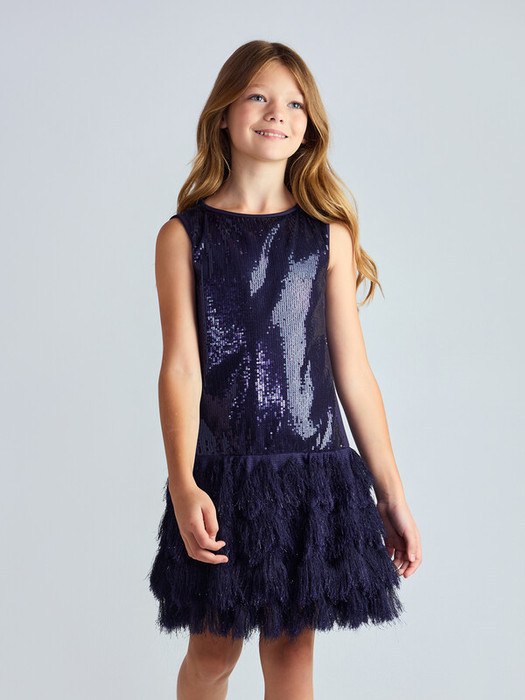 Платье в ретро стиле без рукавов с  акцентом на заниженной линии талии. Лиф усыпан блёстками. Юбка изготовлена из ткани с длинным ворсом и имеет хлопковую подкладку для максимального комфорта. Застежка на скрытой молнии, расположенная на спинке. Такое платье станет верным спутником на любом торжественном мероприятии или вечернем выходе. Оно позволяет создавать образы с ноткой винтажной роскоши.