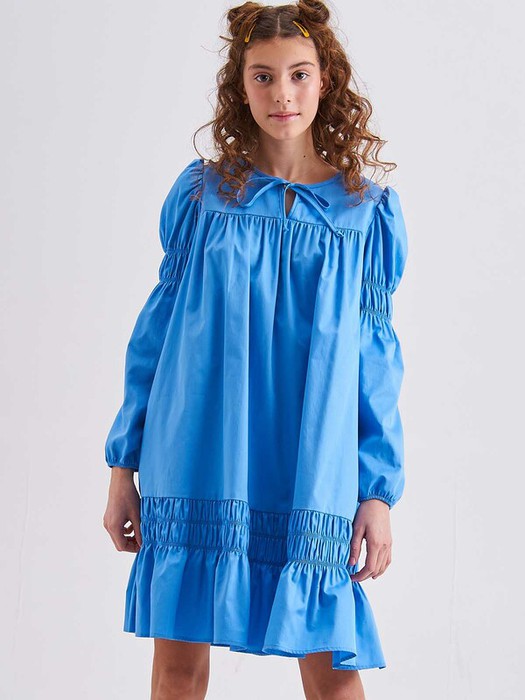 Стильное романтичное платье из хлопчатобумажной ткани свободного силуэта. Горловина на завязках, длинный объемный  рукав собран на резинку, в боковых швах карманы. По волану платья и по рукаву идет резинка для создания эффекта буф.