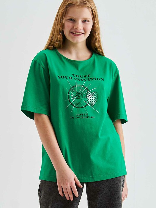 Трикотажная футболка свободного силуэта с принтом и фигурным вырезом по спинке изделия.