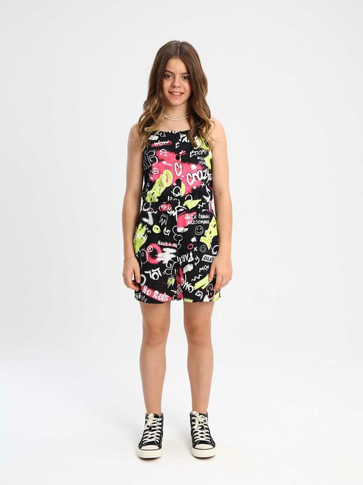 Легкий комбинезон с шортами станет незаменимым предметом гардероба в жаркую погоду. Его можно использовать и как самостоятельный предмет образа, так и дополняя его нижним слоем в виде футболки или рубашкой с коротким рукавом. Стильная граффити расцветка с текстовыми надписями позволяет использовать как светлые, так и темные акценты в аутфите. Модель подчеркивает фигуру благодаря эластичной резинке на поясе и приталенному крою. В легком, но не просвечивающем материале будет комфортно и в городе, и на отдыхе.