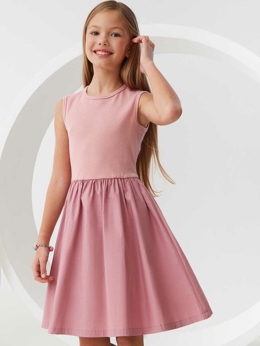 Комбинированное летнее платье длины миди с круглым вырезом на спине. Лиф из мягкого трикотажа в рубчик полуприлегающего кроя. Юбка А-силуэта из плотной хлопковой ткани. Крой с пышной юбкой позволит быть самой активной. Акцент на талии формирует утончённый силуэт. Широкие бретели и U-образный вырез на груди и спинке. Размерный ряд 128 – 176 см.