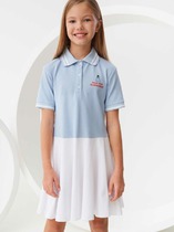 Короткое платье с воротником-поло. Мягкий хлопковый трикотаж пике. Трапециевидный крой с отрезной талией и расклешенной контрастной юбкой. Короткий рукав. Планка с застежкой на три пуговицы. Декоративная полоска на воротнике и манжетах. На груди контрастный принт воланчика и надписью SPORT CLUB BADMINTON (с англ. «спортивный клуб бадминтона»). Размерный ряд 128 – 176 см.
