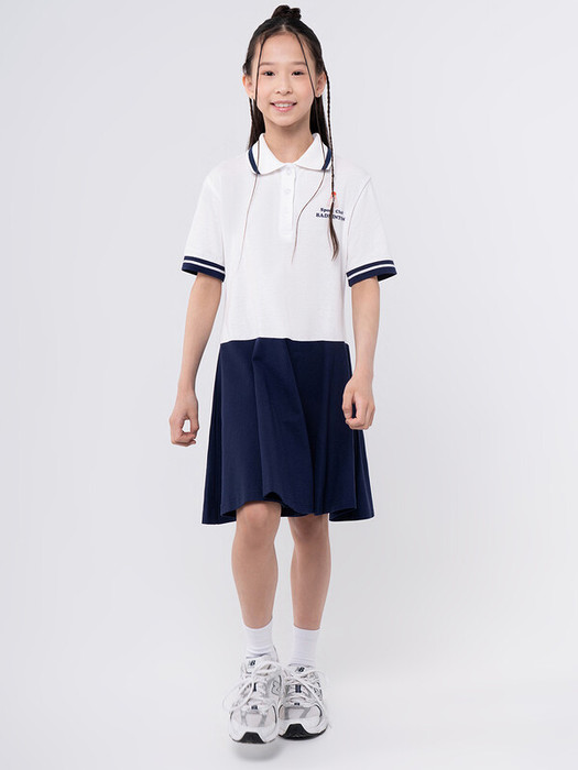 Короткое платье с воротником-поло. Мягкий хлопковый трикотаж пике. Трапециевидный крой с отрезной талией и расклешенной контрастной юбкой. Короткий рукав. Планка с застежкой на три пуговицы. Декоративная полоска на воротнике и манжетах. На груди контрастный принт воланчика и надписью SPORT CLUB BADMINTON (с англ. «спортивный клуб бадминтона»). Размерный ряд 128 – 176 см.