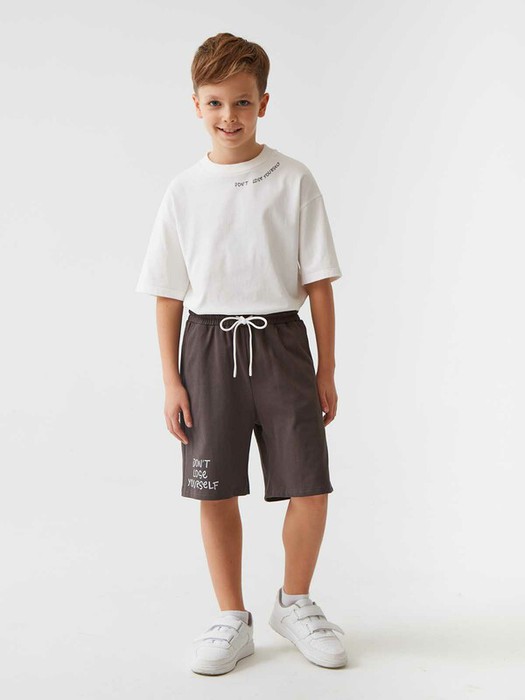Однотонные шорты с принтом DON`T LOSE YOURSELF (с англ. «не потерять себя») спереди. Мягкий трикотаж из 100% хлопка. Свободный крой, средняя посадка, эластичный пояс с кулиской. Функциональные скошенные карманы по бокам. Размерный ряд 116 – 176 см.